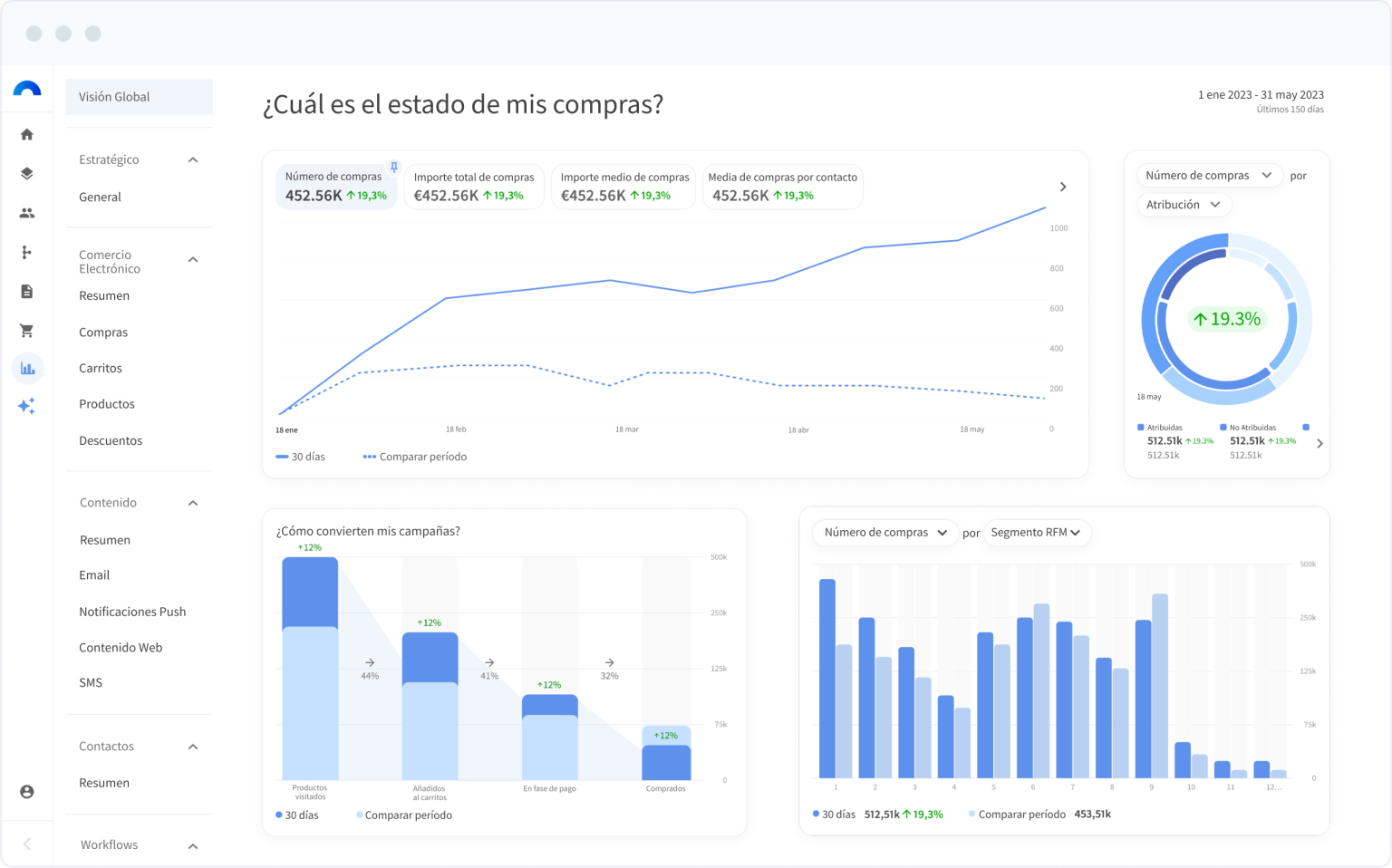 ¿Cómo responden mis suscriptores a mis emails? ¿Consiguen mis notificaciones push aumentar la participación? ¿Cuántos clics ha recibido mi última campaña? ¿Qué canal está generando más ventas?