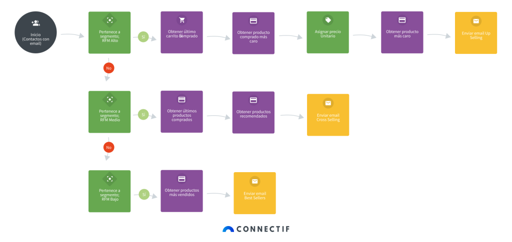 La idea de este workflow es enviar un email con distintas estrategias según el segmento del RFM en el que se encuentre cada uno de tus clientes. Por ejemplo, a los campeones y a los clientes fieles se les envía un email con productos más caros que el producto más caro de su última compra (estrategia de upselling). A los clientes del siguiente segmento, se les envía un email con productos complementarios (estrategia de cross-selling), y a los clientes del tercer segmento se les envía un email con los best-sellers del último mes.