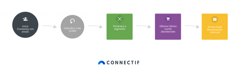 Para enviar un email de carrito abandonado mensual, te proponemos un flujo automatizado que, una vez al mes, compruebe el último carrito abandonado del mes anterior y envíe al contacto un correo electrónico con los productos de esa cesta, para motivarlo a avanzar con su compra.