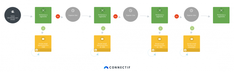 En la imagen puedes ver una propuesta de estrategia consistente en el envío de un email con recomendaciones a los contactos suscritos a la newsletter que llevan más de 90 días sin visitar ninguno de los productos de la web. La idea es tratar de captar su atención y motivarlos a comprar de nuevo.