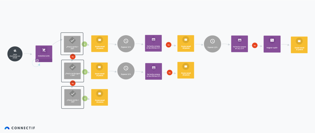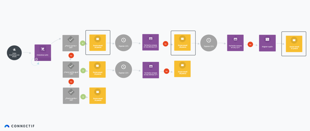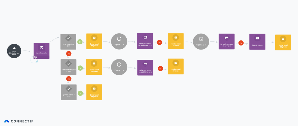 Ten en cuenta que la idea es destinar más esfuerzo a recuperar los carritos abandonados de mayor valor. Por tanto, te proponemos una secuencia de acciones más larga y de mayor coste para esos carts más rentables, y un funnel o secuencia más corta para los de menor importe.
