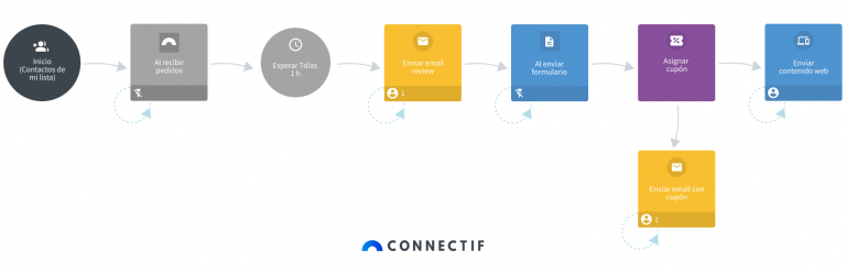 - A continuación, este flujo automatiza el envío de un email con una llamada a la acción para que el cliente deje una reseña en la web, a cambio de recibir un cupón descuento.