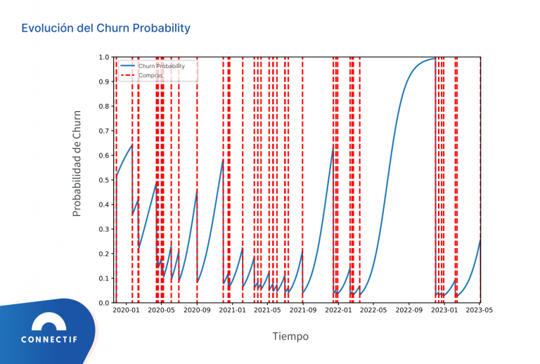 En este gráfico podemos observar como en cada compra, el Churn Rate decrece ya que entendemos que si acaba de comprar, es probable que vuelva a hacerlo. Sin embargo, conforme pasa el tiempo entre compra y compra, el Churn Rate crece. Un hecho interesante que puedes ver en la imagen es que el periodo más largo sin comprar (aproximadamente entre abril y noviembre de 2022) se ve interrumpido por una compra propiciada por contenido promocional enviado a dicho cliente.