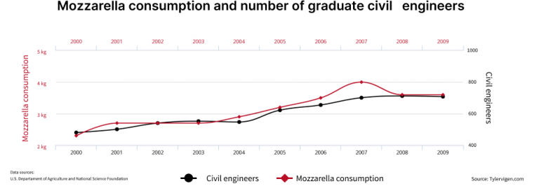 For instance, imagine that two unrelated variables (mozzarella consumption and number of graduate civil engineers) are linked. If we drew a graphic, we could detect a correlation between both of them over the years and reach a conclusion: mozzarella consumption rises when more civil engineers graduate. However, this is an artificial causality, as both events are disconnected from each other. Therefore, a correlation cannot be established.