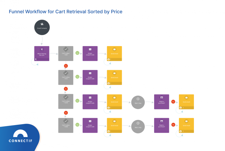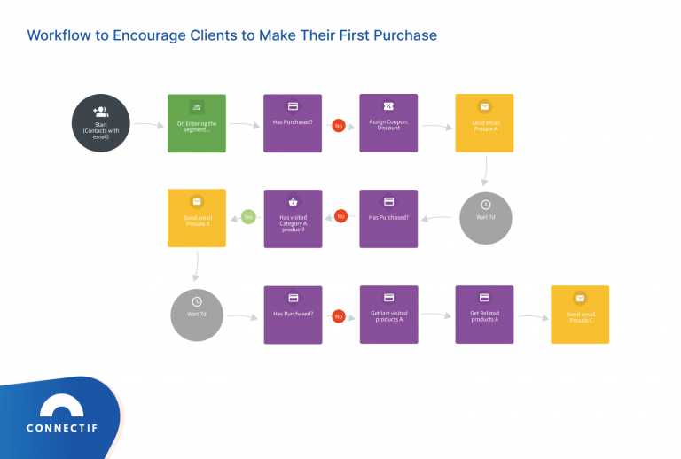 As a spoiler, here is an example of a workflow template for lead nurturing available in Connectif. This useful workflow helps clients to encourage sales from subscribed customers that have not yet made a purchase, through the use of emails with their most popular products and discount coupons.