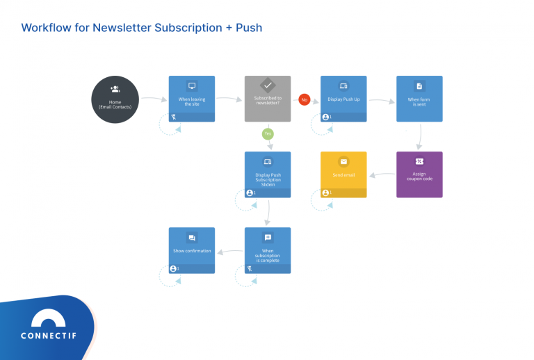 This workflow implemented by Cajadecarton.es served to check the subscription status of each website visitor. If anonymous, the workflow would automatically launch a pop-up encouraging the user to subscribe to their newsletter, hence providing their email address. If a user is already subscribed to the newsletter, the workflow would display a different pop-up encouraging them to also opt-in to push notifications. As a result, the company grew their subscriber base by 55.8%.