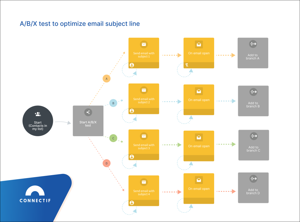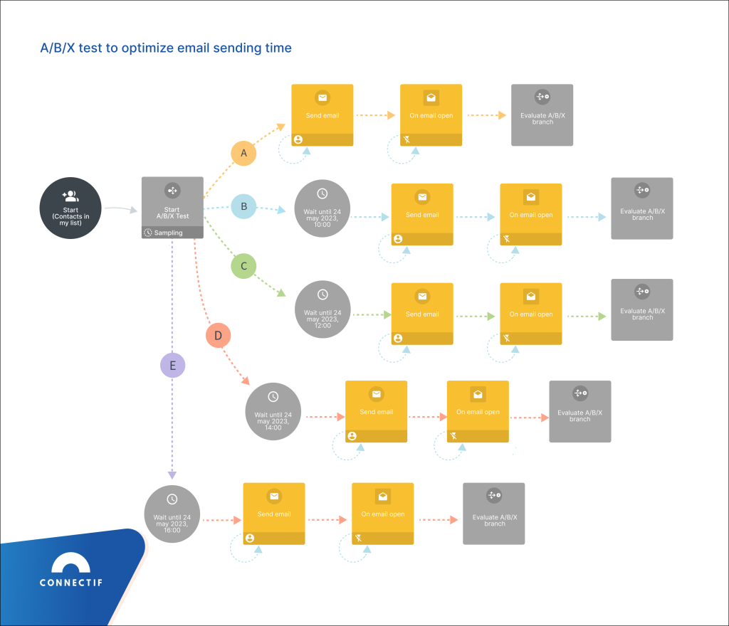 Below, you can see an example of an ABX test workflow built in Connectif to identify the best sending time of an email. As you can see, this test includes 5 different sending times: immediately, at 10 am, at 12 pm, at 2 pm and at 4 pm.