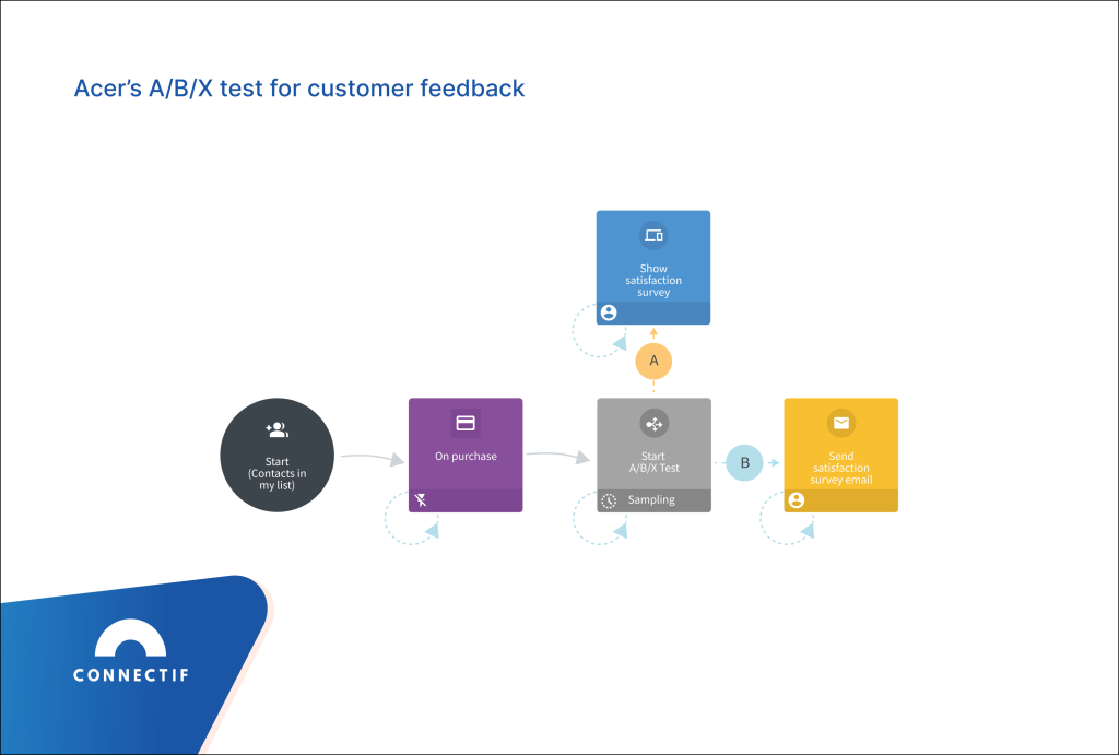 As you can see in the workflow, they compared the performance of sending a customer satisfaction survey to their customers after making a purchase directly on the website with sending the survey via email. Thanks to this test, they identified that they received more responses from the survey on their website. After implementing this strategy to all customers, they saw a 70% improvement in customer survey responses.