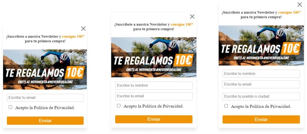 As you can see in the image, they tested three different pop-ups displaying different forms. The winning variant was then implemented in their online shop to grow their subscriber base. As a result of improving their acquisition strategy with this ABX test, Bicimarket increased their subscriber base by 21%.