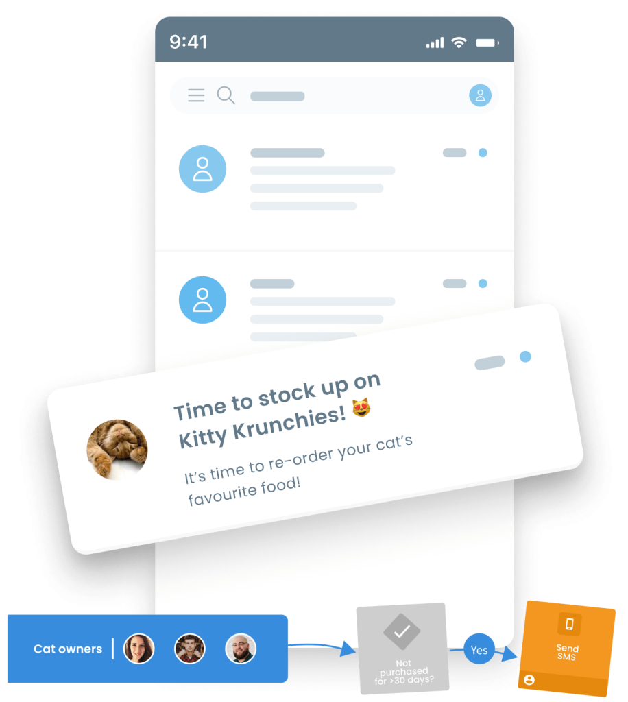Define when to send the SMS for maximum effect. Whether it’s straight after a purchase, subscription sign-up or to reactivate a customer who hasn’t bought cat food in 30 days, the sky is the limit.
