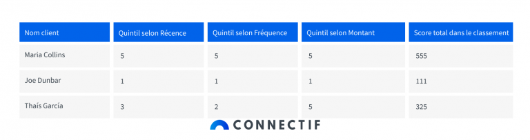 Ainsi, si un client a acheté récemment (Récence), il obtient plus de points. S’il a acheté plusieurs fois (Fréquence), il occupe également une meilleure place dans le classement. Enfin, si le montant total dépensé pour ses achats est supérieur (Montant), il obtient également un meilleur score. La combinaison de ces trois paramètres engendre un classement RFM.