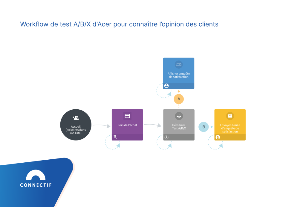 Comme vous pouvez le voir dans le workflow, la marque a comparé les performances de l’envoi d’une enquête de satisfaction client à ses clients après un achat directement sur le site web avec l’envoi de l’enquête par courrier.