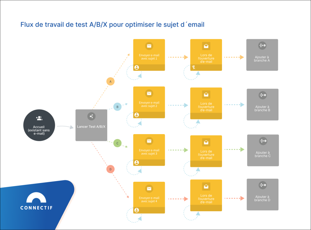 Vous pouvez voir ci-dessous un exemple de modèle de workflow de test ABX qui peut être facilement mis en place avec Connectif pour identifier l’objet le plus attrayant afin d’encourager les clients à récupérer les paniers d’achats abandonnés.