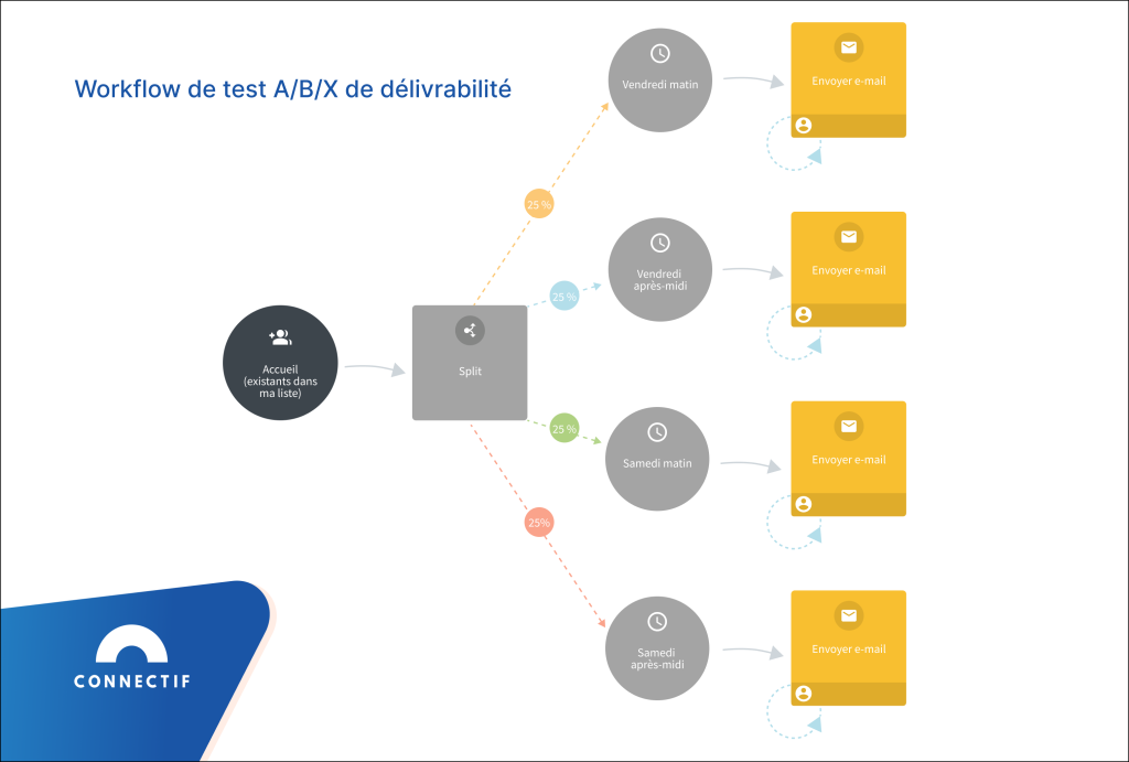 Mexas, la marque espagnole de chaussures et cliente de Connectif, a utilisé la fonctionnalité de test ABX sur notre plateforme pour identifier le meilleur moment d’envoi et améliorer le taux d’ouverture moyen de ses newsletters. Comme vous pouvez le voir dans le workflow ci-dessous, elle a testé l’envoi de la newsletter à quatre moments différents : le vendredi matin, le vendredi après-midi, le samedi matin et le samedi après-midi.