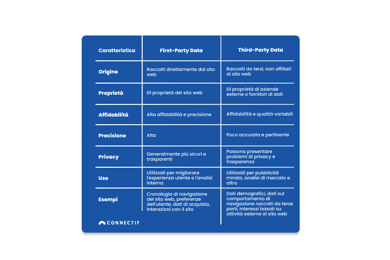 Nella tabella che segue viene mostrato un confronto dettagliato tra dati di prima parte e dati di terze parti nel contesto dell’eCommerce e della raccolta di informazioni online.