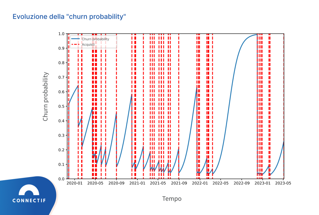 Nel grafico possiamo osservare come a ogni acquisto, il “churn rate” diminuisce, poiché comprendiamo che se un cliente ha appena acquistato, è probabile che lo faccia di nuovo. Tuttavia, man mano che passa il tempo tra un acquisto e l’altro, il “churn rate” aumenta. Un fatto interessante che possiamo notare nell’immagine è che il periodo più lungo senza acquisti (circa da aprile a novembre 2022) è interrotto da un acquisto favorito da contenuti promozionali inviati a quel cliente.