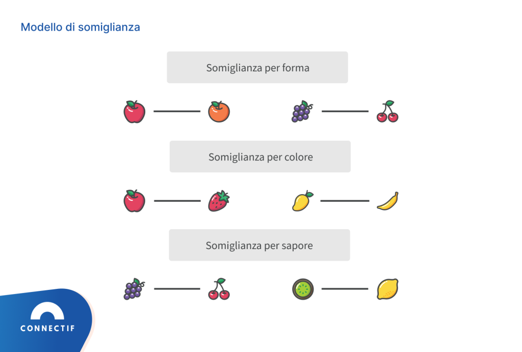 Prima di tutto, puoi vedere che se le raggruppi per forma, quelle con forma rotonda come la mela o l’arancia finirebbero nello stesso gruppo. Se decidi di cercare somiglianze per colore, la mela e la fragola sarebbero nello stesso gruppo, così come la banana e il mango. Infine, se opti per il raggruppamento per sapore, l’uva e la ciliegia saranno nello stesso gruppo perché accomunate da un sapore dolce, mentre il kiwi e il limone saranno in un gruppo separato perché hanno entrambe un sapore più acido.
