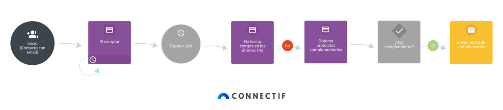 Al registrar una compra en la web, el sistema automatiza una espera de 14 días para comprobar si ese cliente ha realizado algún nuevo pedido en ese periodo de tiempo. Si no lo ha hecho, se recuperan los últimos productos comprados y se asignan (si existen) productos relacionados complementarios. Con esas recomendaciones personalizadas, se envía un email al cliente para motivar su reactivación.