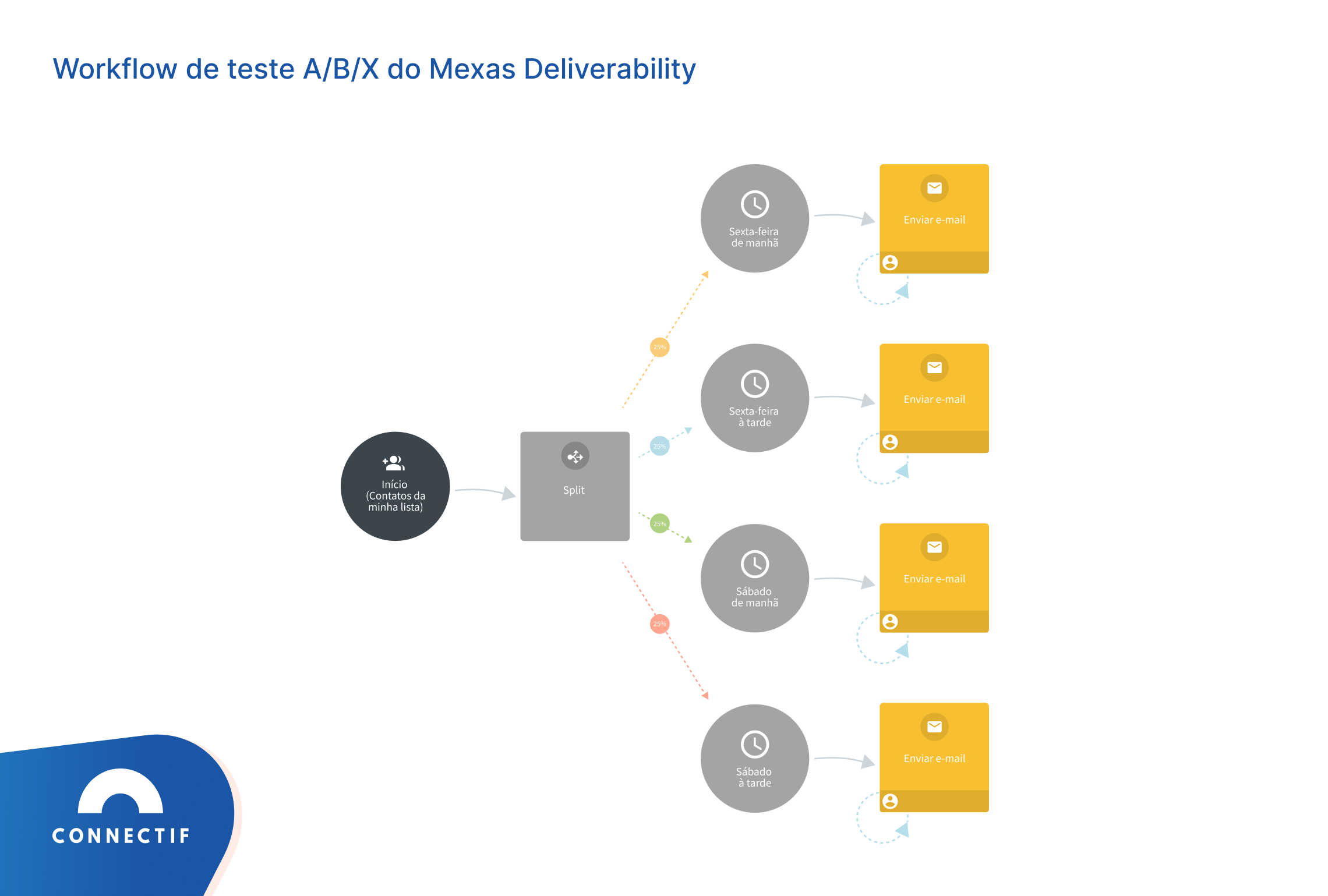 Mexas, a marca espanhola de calçados e cliente da Connectif, usou a funcionalidade de teste ABX em nossa plataforma para identificar o melhor horário de envio e melhorar a taxa média de abertura de seus boletins informativos. Como você pode ver no fluxo de trabalho abaixo, eles testaram o envio do boletim informativo em quatro horários diferentes: sexta-feira de manhã, sexta-feira à tarde, sábado de manhã e sábado à tarde.