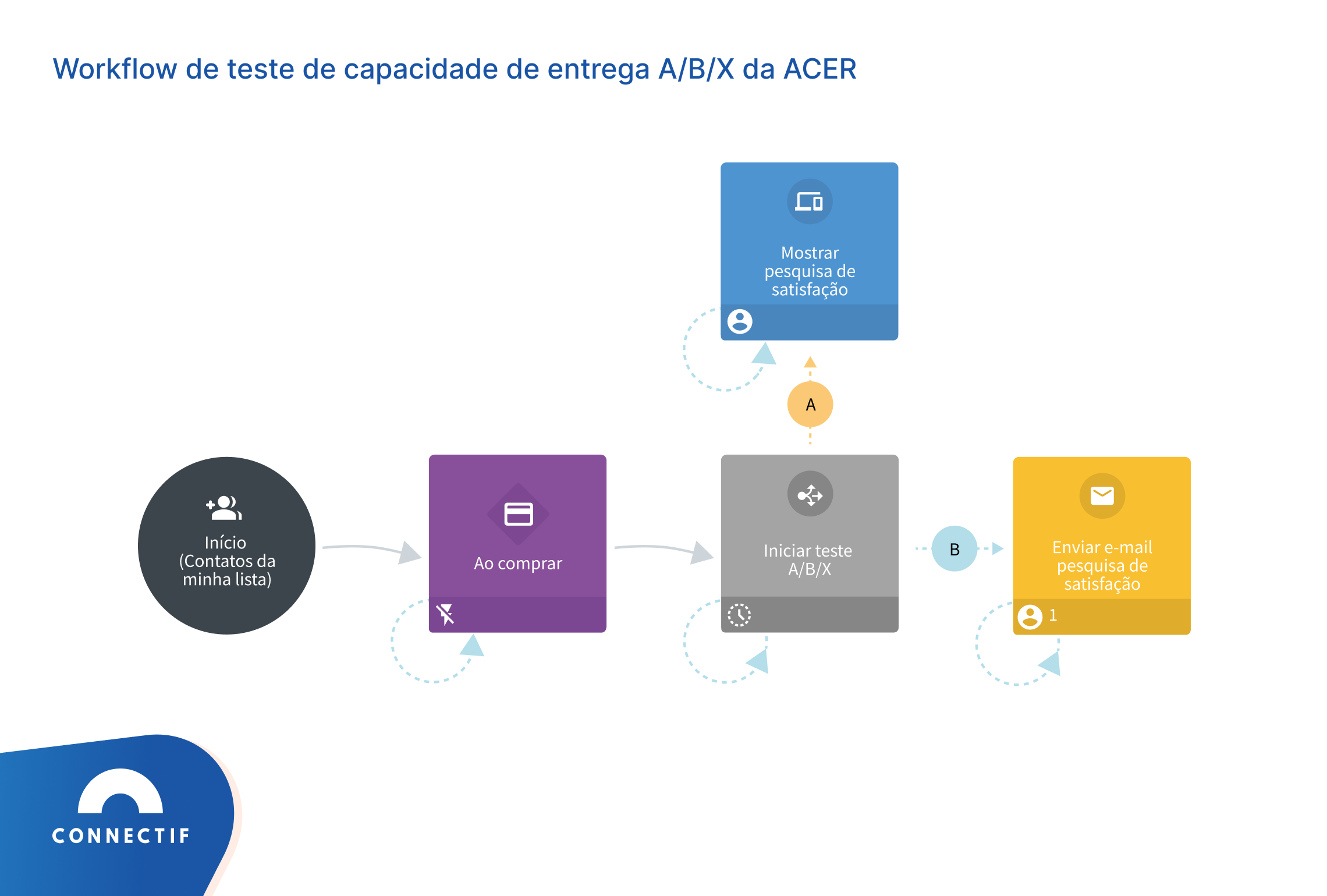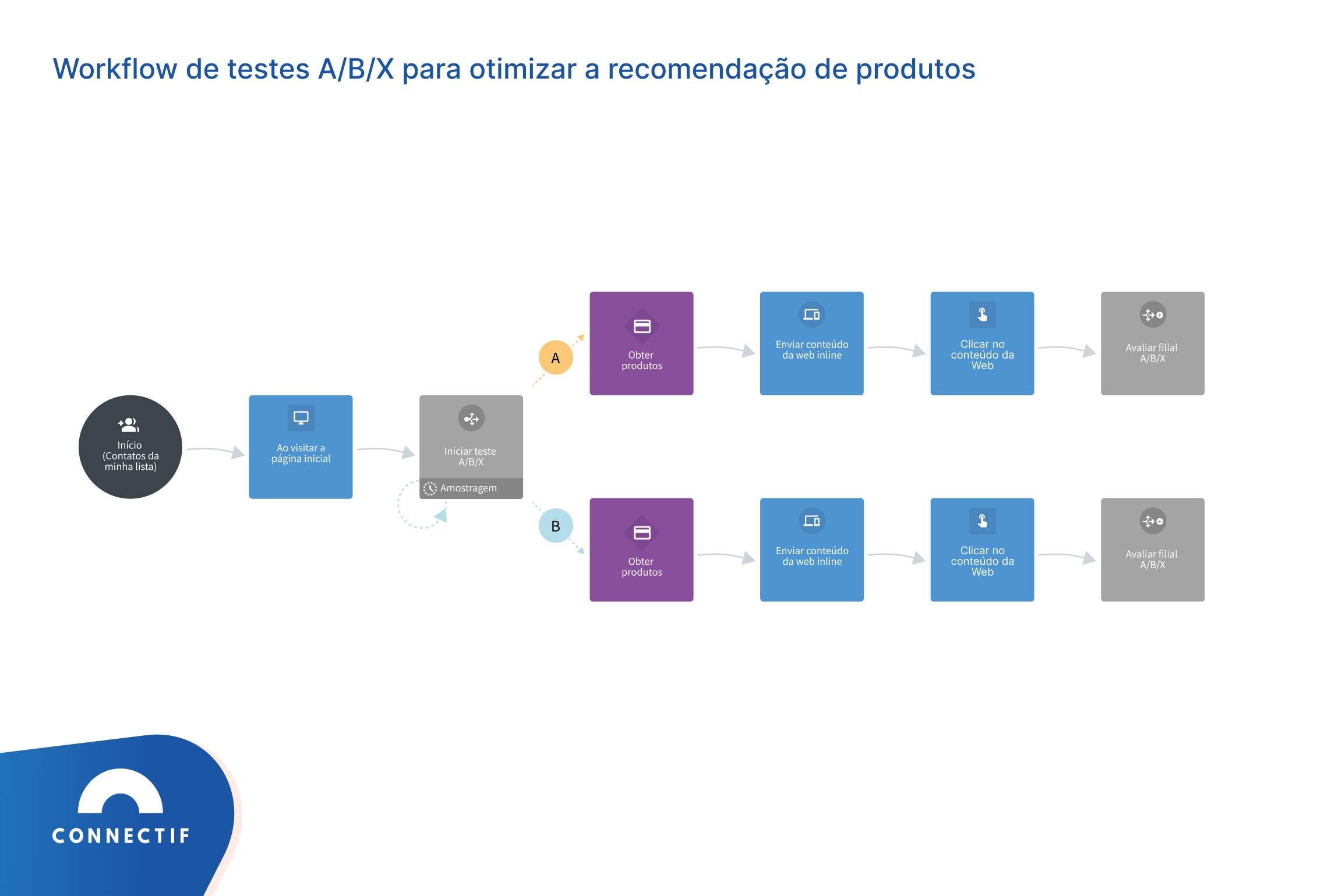 O resultado de um teste ABX é medido pela taxa de conversão alcançada, seja um clique, uma compra ou uma visita à página do produto. Você pode realizar essa análise manualmente, no entanto, algumas ferramentas de teste, como Connectif, fazem todo o trabalho pesado para você e revelam o claro vencedor e os resultados assim que o teste for conclusivo. Nesse caso, tudo o que resta a fazer é implementar a mudança desejada na estratégia e alcançar seu objetivo!